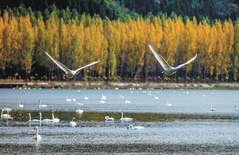 The Yellow River wetland in Pinglu county is now a habitat of migrant birds like swans, thanks to its improved environment. (China Daily/Liu Wenli)