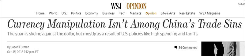 Δ The Wall Street Journal published an article on Oct. 15, arguing that “the Trump administration is railing against Chinese currency manipulation without any regard for the yuan’s actual ups and downs”.?