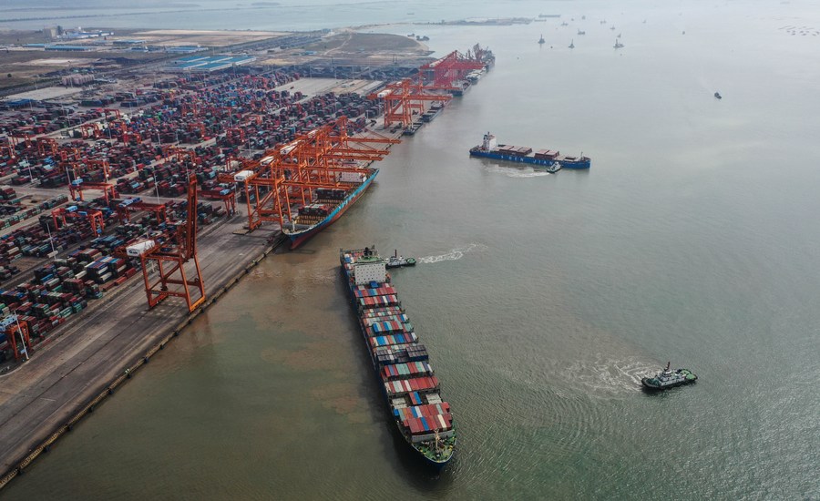 Aerial photo taken on Nov. 19, 2020 shows a cargo ship leaving a berth of the Qinzhou Port in south China’s Guangxi Zhuang Autonomous Region. (Photo/Xinhua)