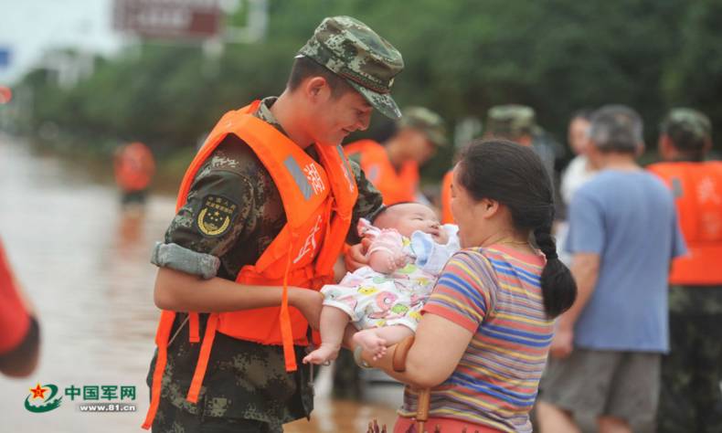The feature picture shows that on?August 14th, 2017, the Xianning detachment of the armed police force transferred the local residents when heavy rain hitted Xianning, Hubei.